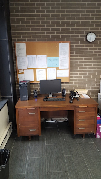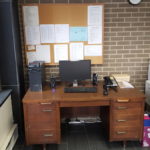 desk, computer, avaya phone, bulletin board