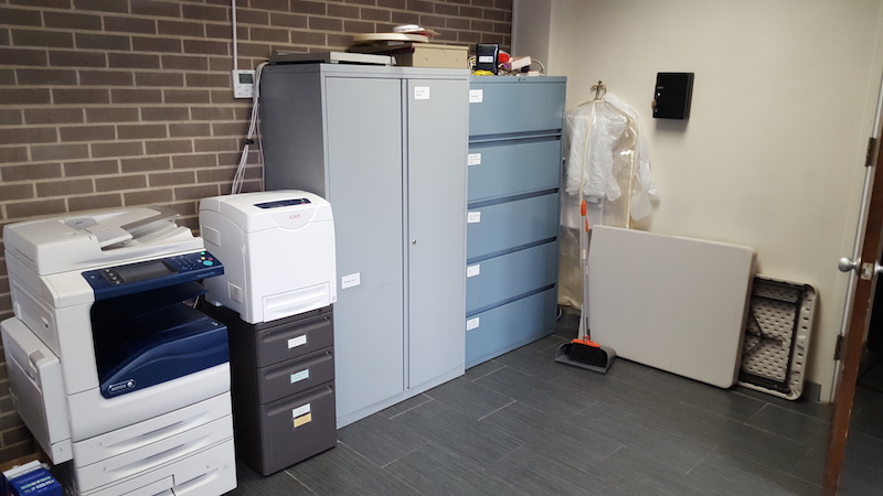 filing cabinets, color printer, folding table
