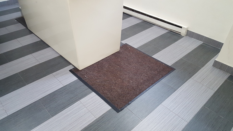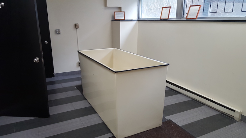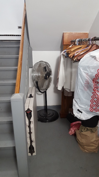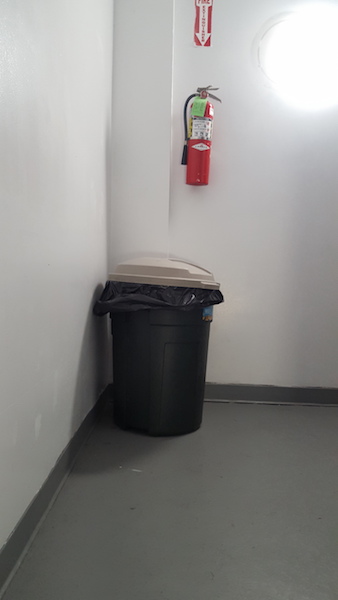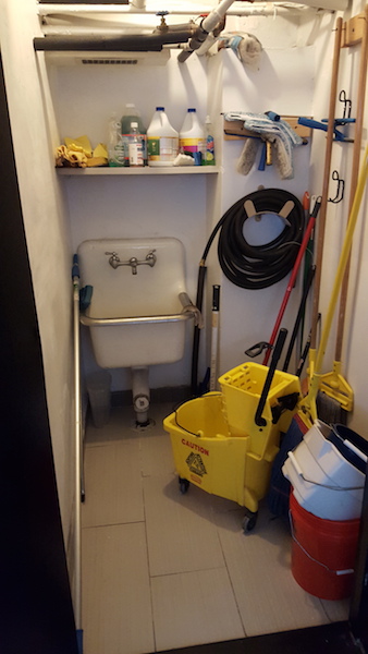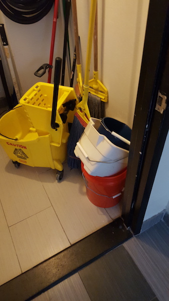 baptismal, cleaning supplies, commercial fan, folding table, garbage bins, rug, window cleaning equipment