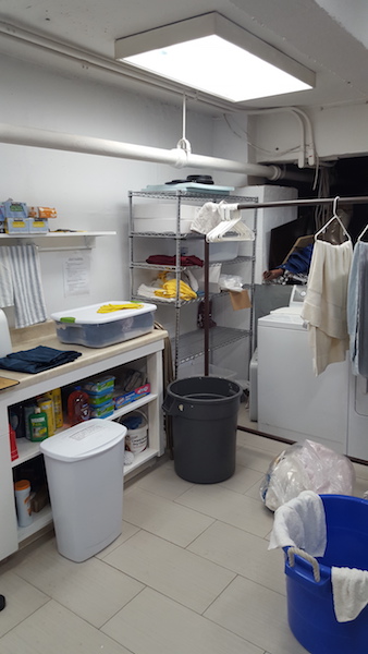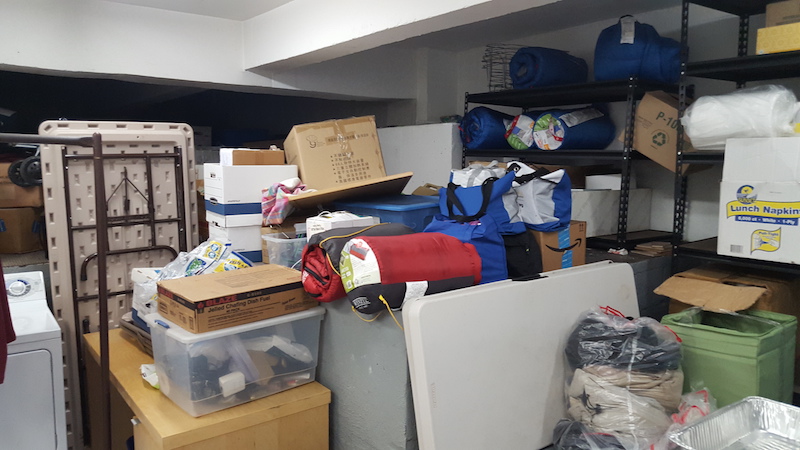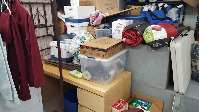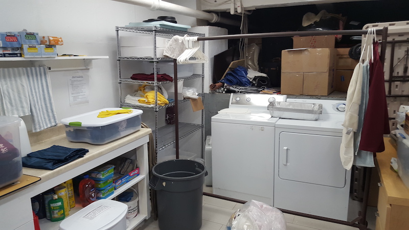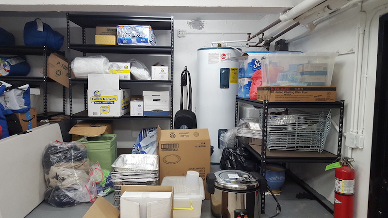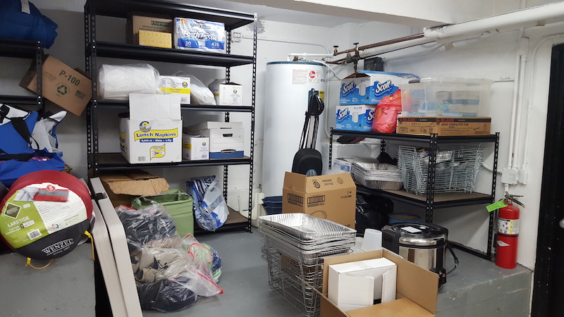 av equipment, baptismal gear, cleaning supplies, coat rack, desk, folding table, home improvement supplies, lost&found, love feast supplies, personal storage, shelving, sink, washer/dryer