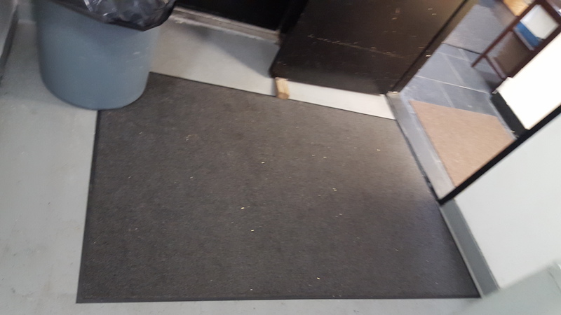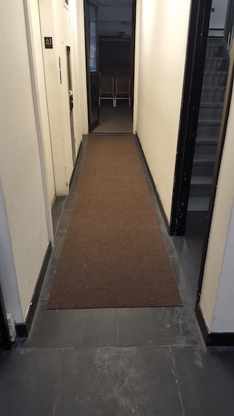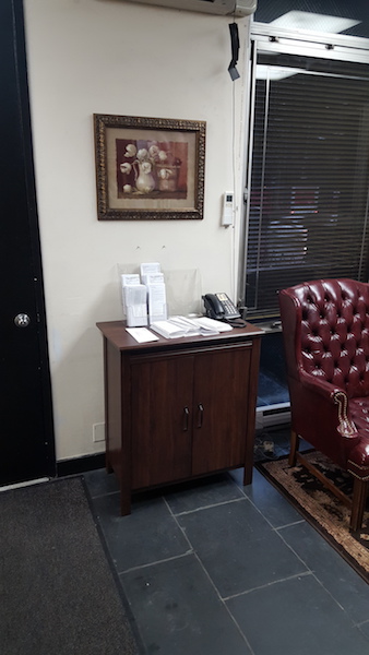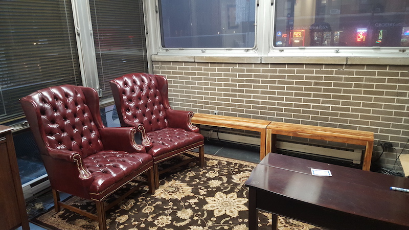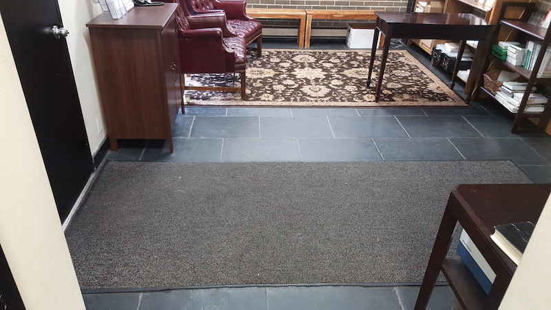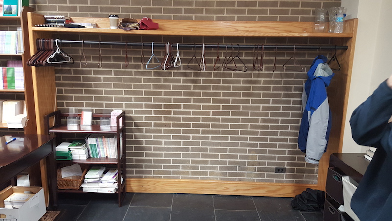 armchair, bench, books, bookshelf, bulletin board, cabinet, coat rack, console table, hymnals, rug, runner