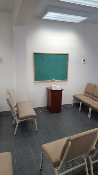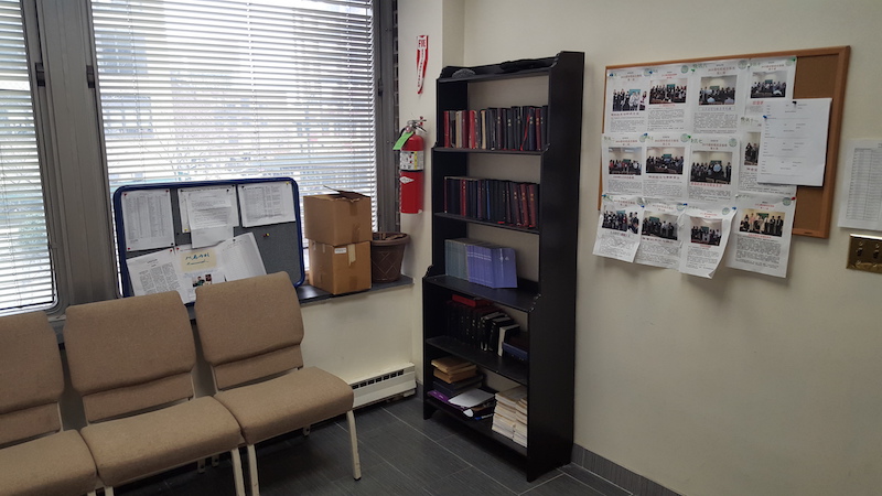 books, bookshelf, bulletin board, chalkboard, hymnals, piano, small computer table