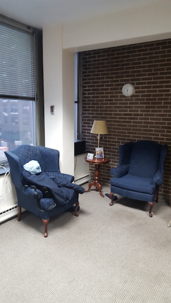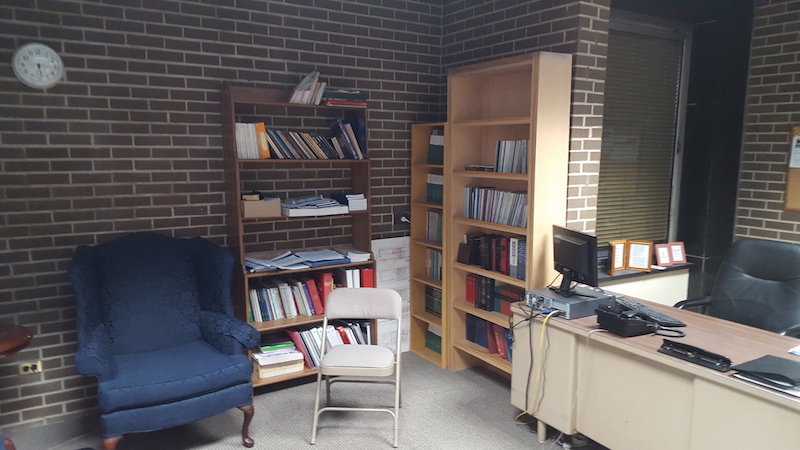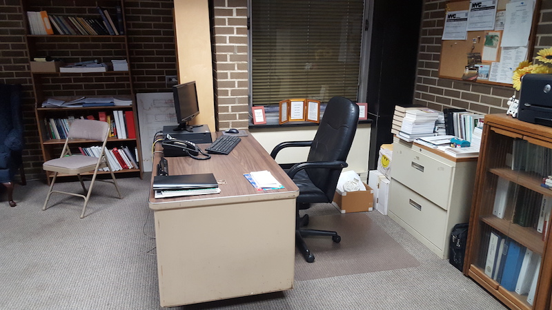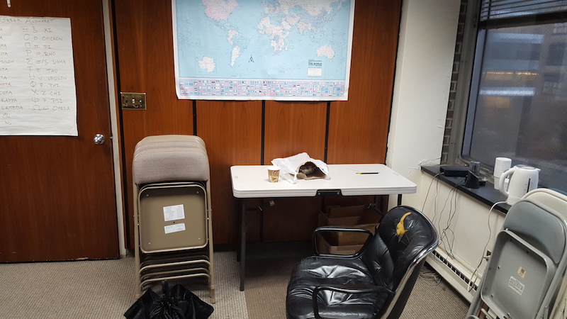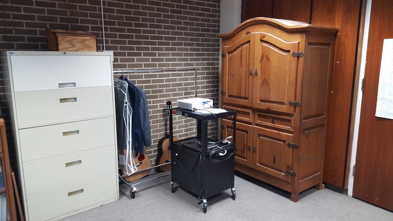 armchair, books, bookshelf, coat rack, computer, desk, desk chair, folding table, small table