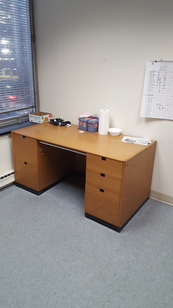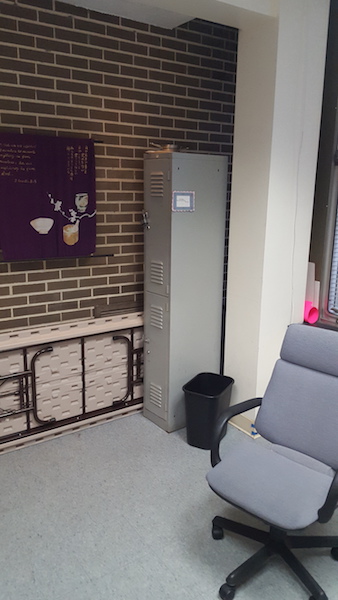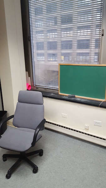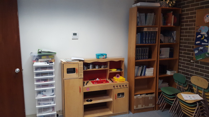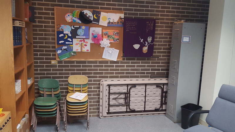 books, bookshelf, bulletin board, chalkboard, desk, desk chair, folding table, kidschairs, locker